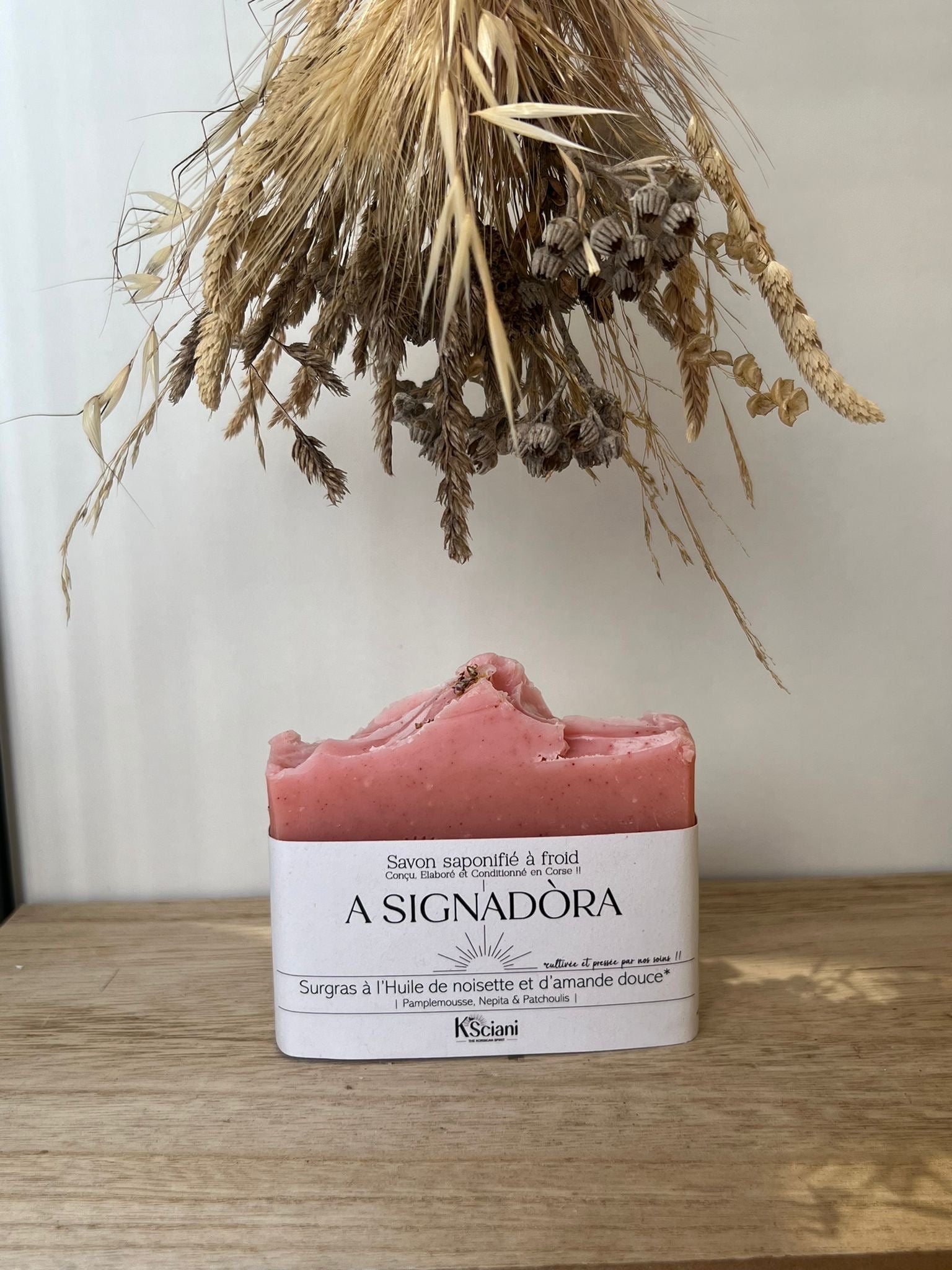 Bienvenue dans l’univers envoûtant de notre savon « A Signadora », un hommage à la tradition Corse en lien avec la « magie blanche » incarnée par la Signadora, détentrice du pouvoir des mots et des signes pour libérer toutes personnes atteintes d’énergies néfastes.